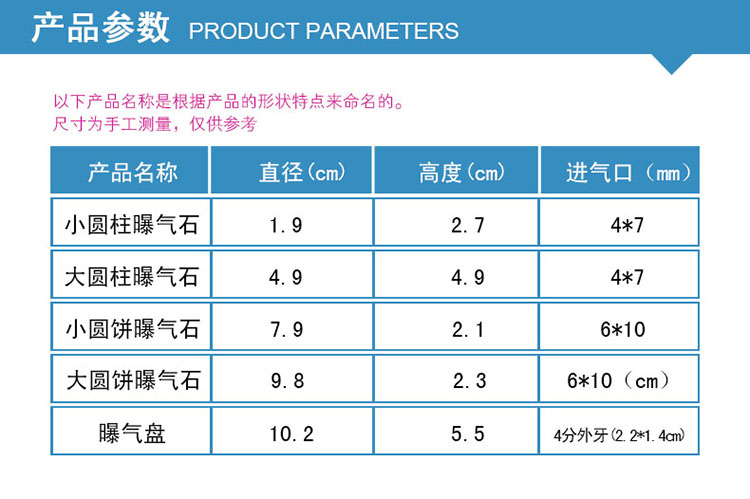 使用壽命長達10年。特別適用于城市污水、大 型用水工廠新建擴建和老曝氣池改造。曝氣頭接口方式有4分口,6分口,可內(nèi)或外螺紋。